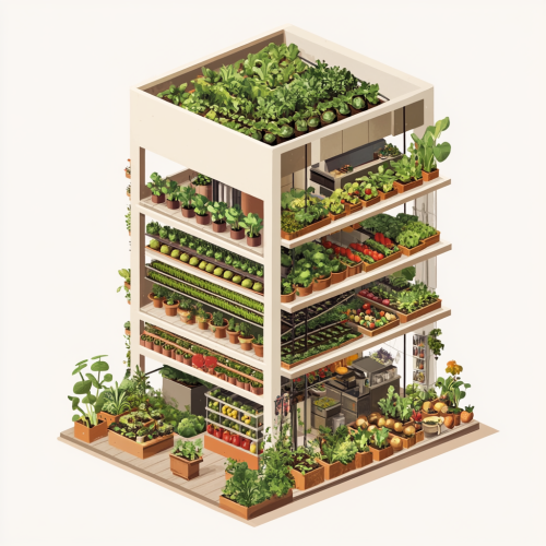 A geometric 1 story building illustration cutout with a vertical farm inside. Fruits and vegetables growing on stacked layers and shelves in the entire building.