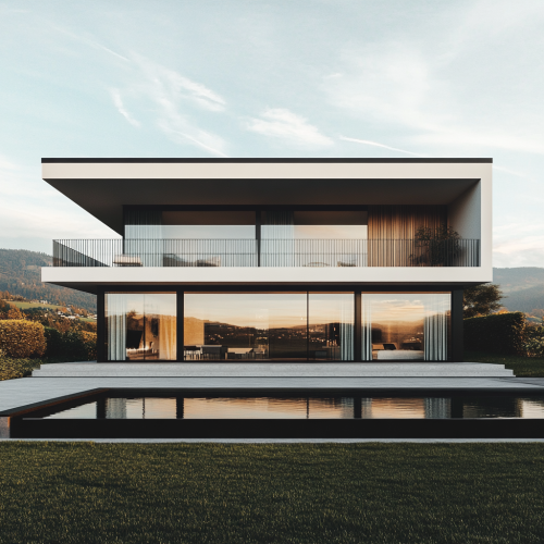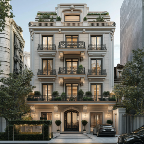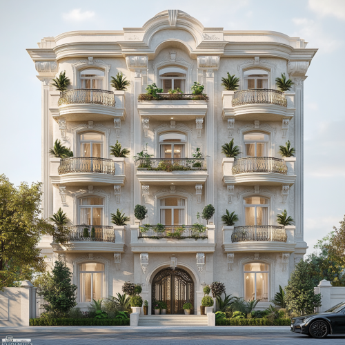 Front view of an 8-level classical design building, 22 meters wide. The ground floor has plants on the left side and an entrance on the right. Each floor has 2 residential units, with two classic balconies extending from the facade on each level. The top floor features a penthouse with additional plants on the terrace.
