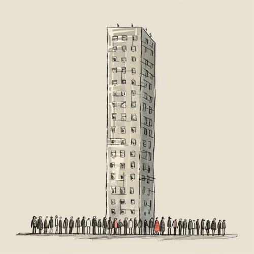 a simplified cute hand-drawn pen illustration of many people lining up in front of a very tall building --v 6.0 --style raw