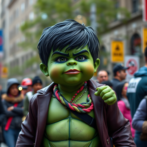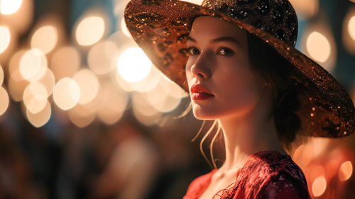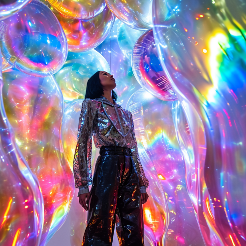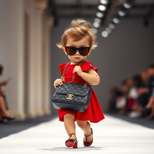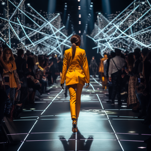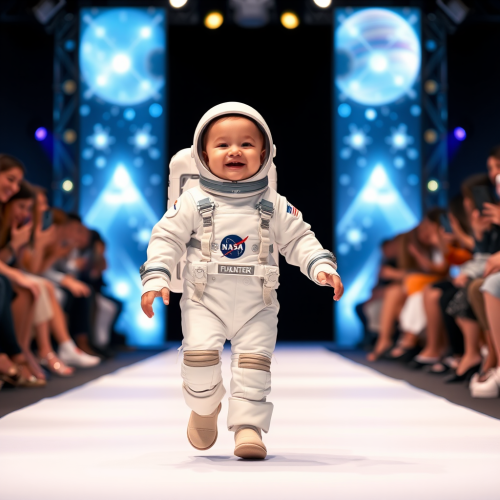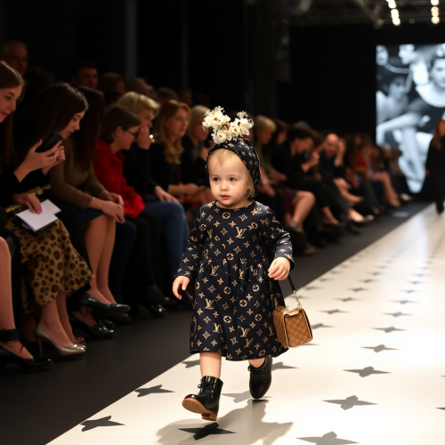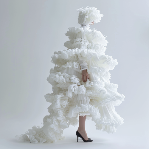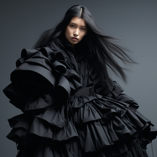 Photography Style Selected: Collection Format Fashion Elements: Avant-garde esthetic, akin to Comme des Garçons, with an emphasis on shape and volume Fashion Coordination: A full-body runway attire consisting of a dramatic, voluminous ruffled sleeveless top, styled with an all-black oversized military jacket Background Setting: A model caught in the beam of a spotlight against a backdrop of darkness, with the audience illuminated by faint ambient light Model/Subject Description and Action: A Japanese woman with a short black bob, who infuses a haunting presence as she traverses the runway Optical Effects: Accentuate with reflections for a heightened sense of drama Headgear Details: Ensure that the model is wearing a significant headgear piece elaborately constructed from black diamonds, large enough to cover the upper half of her face Additional Instructions: The black diamond headgear should be heavily emphasized as it creates a striking contrast with the darkness of the background and the model’s intense, ghostly walk down the runway. Final Prompt (in English): Create an image depicting a haunting full-body runway presentation in the Collection Format. The spotlight should capture the model, a Japanese woman with a short black bob, wearing an all-black outfit highlighted by an enormously voluminous sleeveless top and an oversized military jacket. Her head is adorned with an imposing headgear meticulously designed with black diamonds, obscuring half of her face and significantly emphasized within the composition. She moves eerily down the runway in sharp contrast to the dark ambiance, with the audience lightly aglow in the periphery. The use of reflections is integral to the photograph, enhancing the dark yet dramatic aesthetic of the scene.
