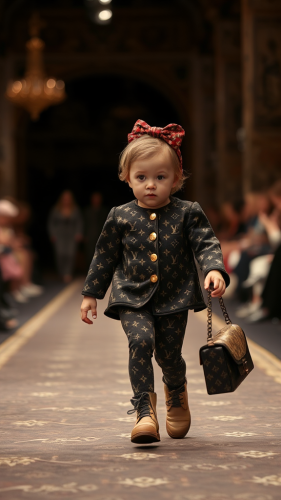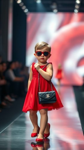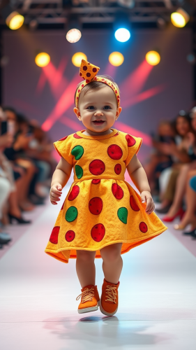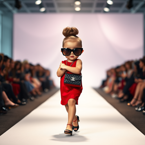 Digital Art Style: A nighttime fashion show on the neon-lit streets of a futuristic city, where the baby piglet walks the runway in an LED-lit outfit, with dazzling lights from surrounding buildings enhancing the spectacle --ar 9:16 --s 750 --v 6.0