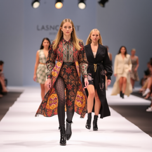 A tall model on the runway at a fashion show.