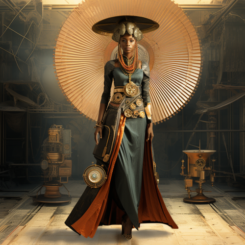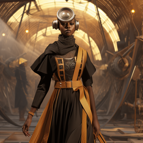 Time Traveller's Runway: Create a fashion-forward outfit that combines elements of Afrofuturism with a twist of fashion from different eras - from ancient civilizations, medieval times, Victorian elegance, to futuristic styles. Let your imagination travel through time and blend the best of the past with the future, runway model fashion show scenery, fullbody view of affits, p v:51