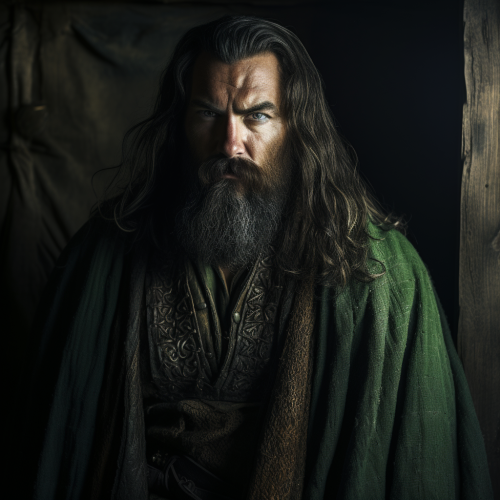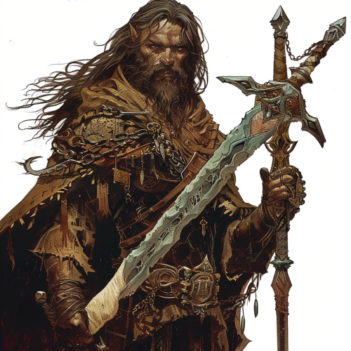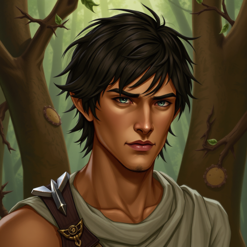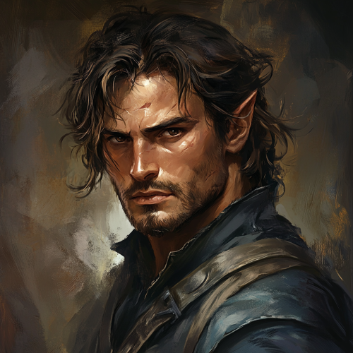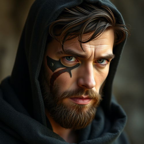 Create a fantasy portrait of the same man as previously described: brown, slightly shaggy hair and brown eyes. This time, his expression should be fierce and resolute, showing aggression or determination. He wears rugged, battle-worn clothing or armor, still featuring the small scar on his face. The background should be chaotic or dark, with elements of dark magic or battle scars, reflecting his role as a ruthless servant of a Fiend.