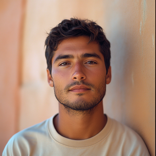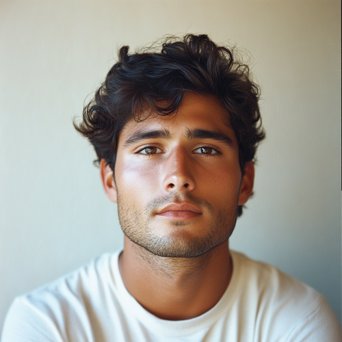 photo of an american- mexican-portuguese man, oblong face, dark brown hair, dark brown eyes, and tan skin. He is wearing a plain matte-colored t-shirt. Shot on kodak portra 160 film --s 250