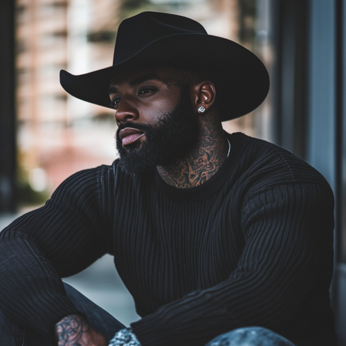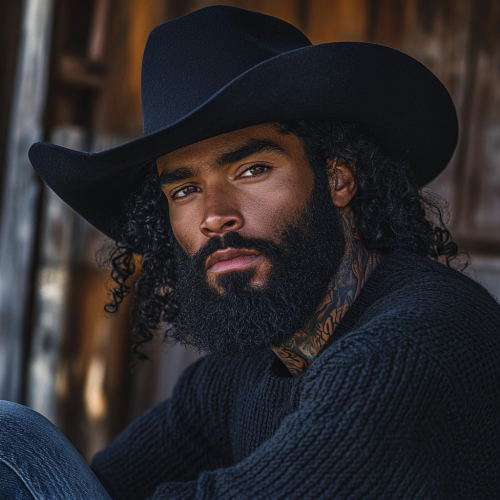 A athletic build BLACK MAN with RICH DARK SKIN and A BEARD. He’s seated outside; wearing a black cowboy hat and his long curly hair can be seen underneath it. He’s wearing a black sweater that shows DETAILED tattoos on his neck ONLY! Street country guy, mafia vibe.