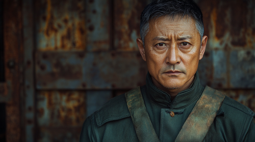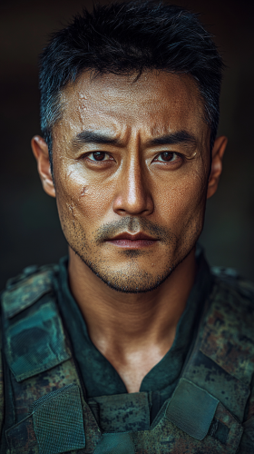 Chinese general, 52, tall, lean, muscular, black hair, dark eyes, scar, weathered face, left figure.