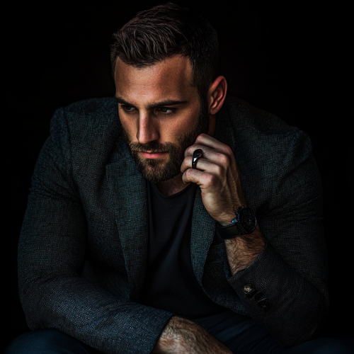 A moody and introspective portrait of a man with a muscular build, seated with his arm resting on his knee. He has a well-groomed, full beard and short, dark hair. The man is wearing a fitted, professional office blazer in a dark color, with a black t-shirt underneath. He also has a black bracelet and a black ring on his finger. The background is completely black, emphasizing the sharp contrast between the blazer and his skin. His expression is thoughtful, with his head resting on his hand as he gazes downward, creating a contemplative and slightly melancholic atmosphere. The lighting is soft and dramatic, highlighting the texture of the blazer and the contours of his face and arms, casting subtle shadows. The overall composition maintains a strong focus on the subject, with minimal distractions in the frame, evoking a professional yet introspective mood.