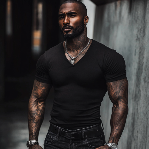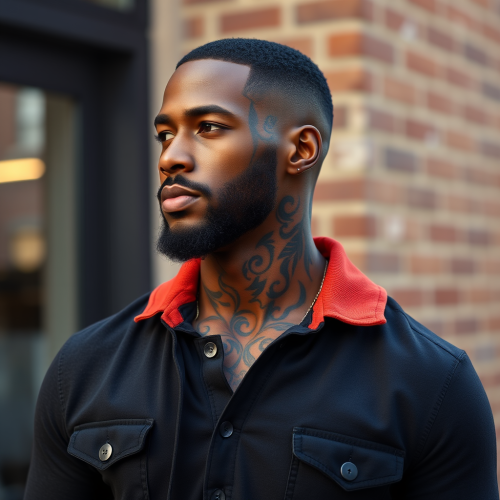 A black DARK Skinned man. He is TALL with close cut, fine silky hair and a full beard. His edge up is sharp and perfect! The lighting highlights his muscular physique. He is handsome with detailed tattoos and a Cuban chain.
