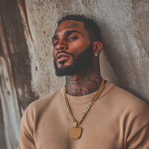 athletic build BLACK MAN standing against a wall with RICH DARK SKIN. He has DETAILED tattoos on his neck ONLY, wearing a tan sweater with a gold Cuban chain. He has a beard and close-cut, silky hair. His edge up is sharp and perfect! Street guy, mafia vibe.