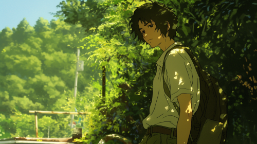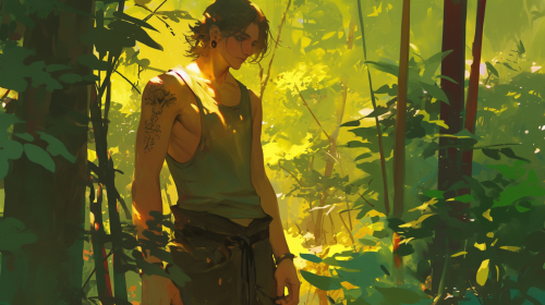 A wild, thin and wild look young man standing , sunburned skin , a skateboarding section that blends into the forest , lomg black hair and beard , --niji 6 --ar 16:9