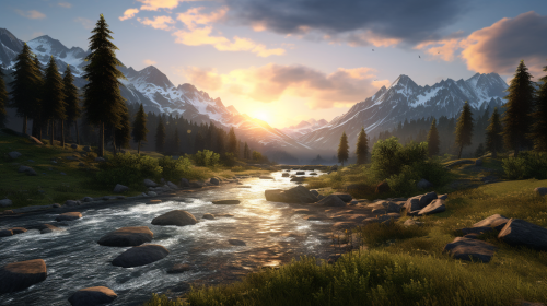 use unreal engine to create a realistic picture of a alps landscape with a rivers, tree and a beautiful sunset. A man in his twenties with a medium but muscular build is looking at this landscape and we see him from the back. The man has a neatly trimmed dark beard and really short, evenly trimmed cut dark hair. His complexion is tan. He's wearing a relaxed fit black t-shirt and white trousers. The man is standing confidently with a calm expression and looking at the landscape. photorealistic, photo realistic --ar 16:9