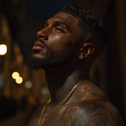 A black man with detailed tattoos, STANDING OUTSIDE. He’s in a contemplative pose with head slightly turned to the left. He has close-cut, fine silky hair. He has a beard and PERFECT, STRAIGHT GOLD TEETH. The city lights reflects on his tattoos and rich CHOCOLATE DARK COMPLEXION.