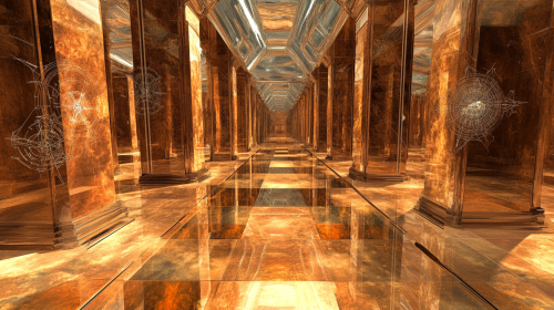 Scifi building lobby inspired by the movie dune, interior walls made of glass to create rooms, with the outter walls resembling ancient greek architecture, fractal imagery scattered throughout as decoration, no people --v 6.1 --ar 16:9