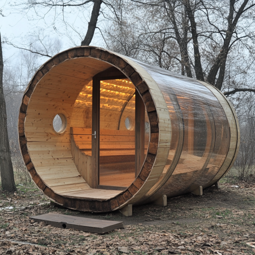 DYI wood structure wood cylinder wood house with transparent plastic roof sheets on the outside placed to wrap the cylinder, the face of the capsule has a sliding door, the material is transparent plastic roofing sheets, not glass