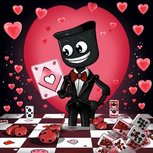 Generate a 2D cartoon image featuring a black Monopoly Go man against a Valentine's Day-themed background. Utilize hearts on the dice as the dot indicators.