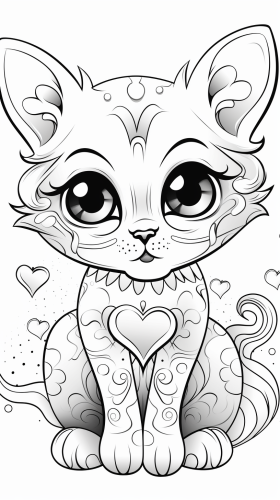 cute cat, valentines day, hearts, coloring book page, in the style of cartoon, low detail, black and white, no shading, white background --ar 9:16