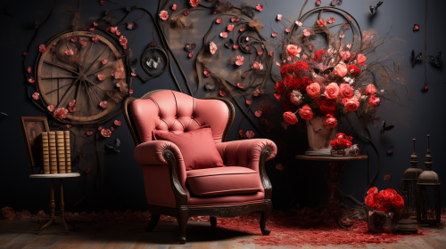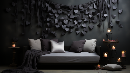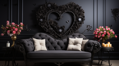 Elegant and stylish Valentine’s Day. Design and decor. Industrial art style. Tapestry of whimsy. nostalgia with a dash of quirky charm. Shot with a Pentax. K - 3 III Monochrome. Mysterious. Important. High - end. Very Stylish. --ar 16:9 --q 0.5 --s 750