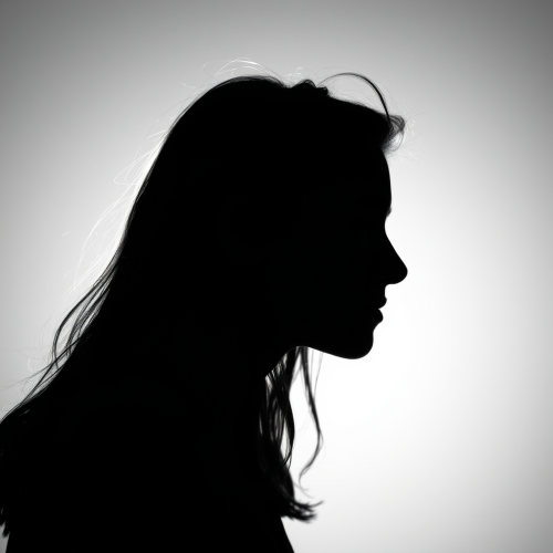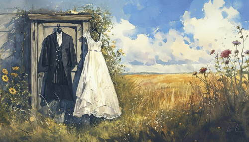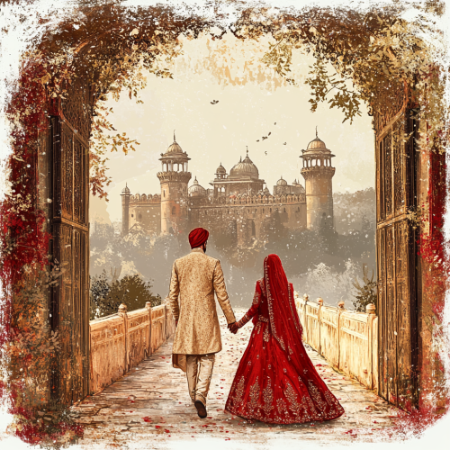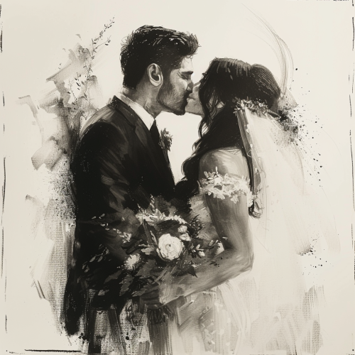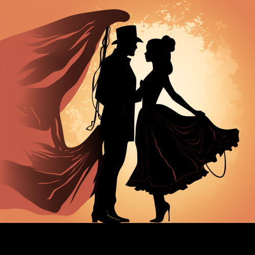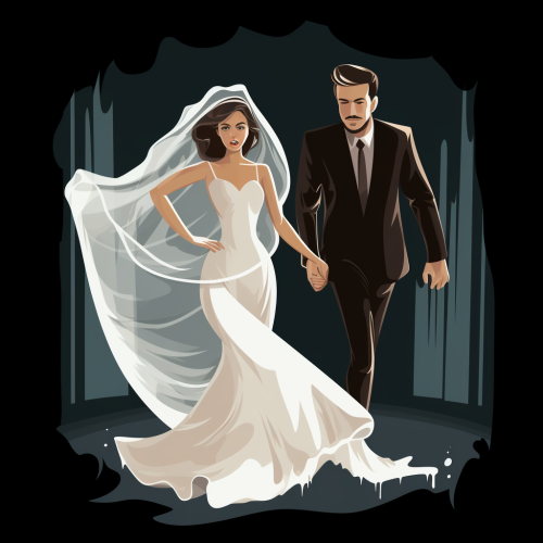 Silhouette of a groom with a bridal hat and a bride with a veil. The man is jumping with a tall hat on his head, while the woman is standing, with a long dress and veil flowing in the wind, pulling the groom by the collar.