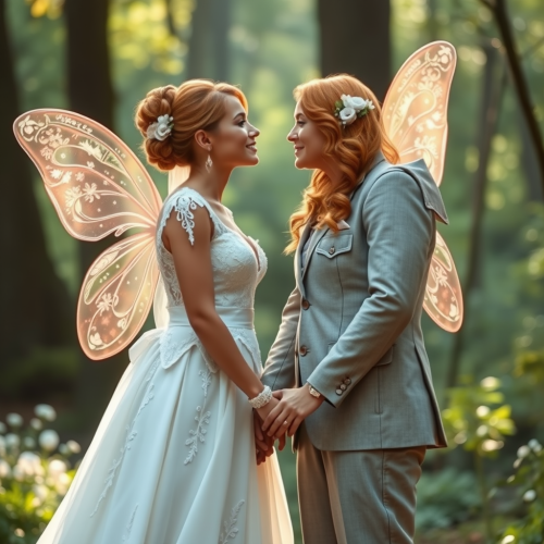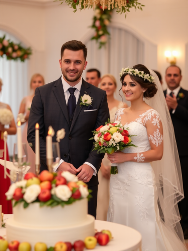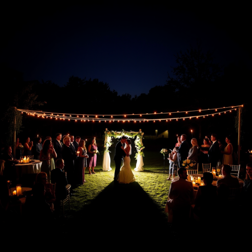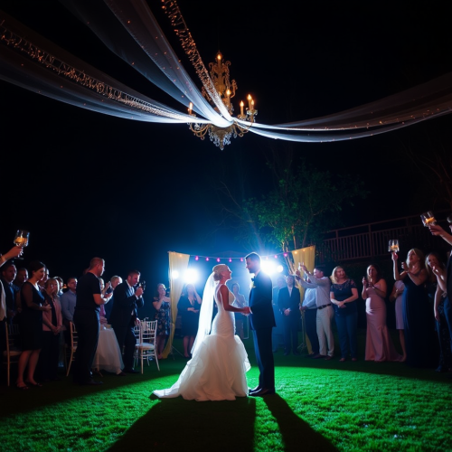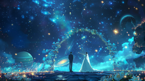 A breathtaking wedding set on a floating platform in space, with the bride and groom standing beneath a glowing arch made of stars and nebulae. The deep Konkikyō Blue sky and a distant planet serve as the backdrop, while holographic flowers and lights in Green Elliott and Sunny Lime create a romantic, dreamlike atmosphere. The scene captures the essence of a magical, otherworldly wedding. Created Using: digital painting techniques, sci-fi aesthetics, dynamic lighting, hd quality, vivid contrasts, romantic composition, intricate details --ar 16:9 --v 6.0