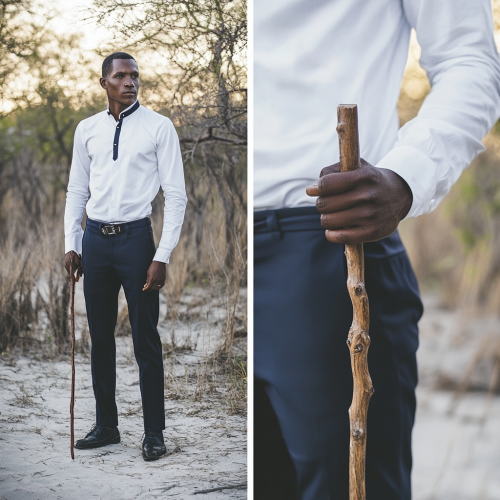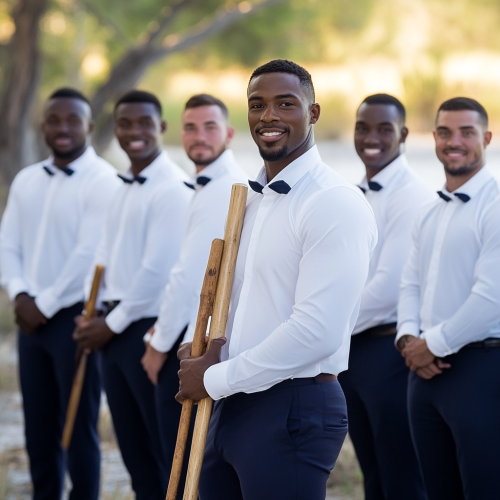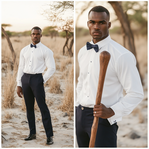 wedding groom in Botswana with groomsmen, groom is holding a wooden staff, photo shoot, the are wearing navy trousers and black shoes with white shirts that have a navy trim down the front and on cuffs, they are very neat and handsome, modern, the image should be relevant to location