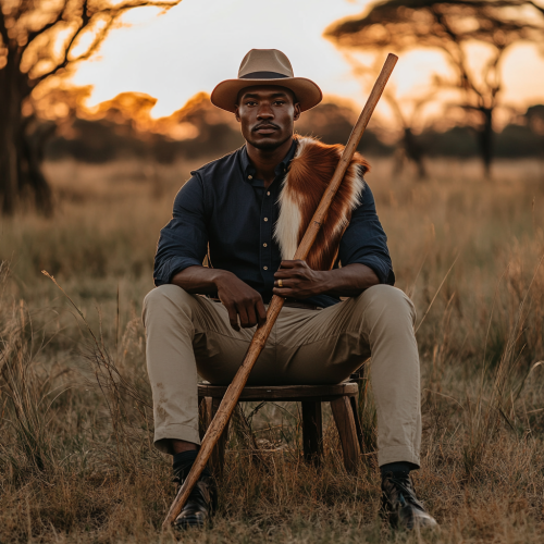 wedding groom in Botswana, groom is holding a wooden staff, photo shoot, he is sitting on a wooden royal chair, wearing a cowhide hide on his shoulders, wearing khaki trousers and black shoes with navy shirt and khaki Fedora hat, very neat and handsome, modern, the image should be relevant to location, almost sunset , regal shot