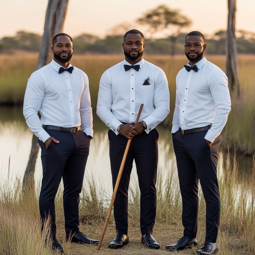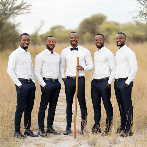 wedding groom in Botswana with groomsmen, groom is holding a wooden staff, photo shoot, the are wearing navy trousers and black shoes with white shirts that have a navy trim, they are very neat and handsome, modern, the image should be relevant to location