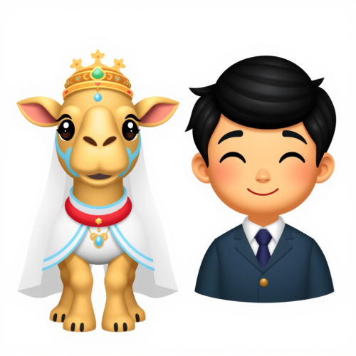 a character illustration of a bride and groom holding hands. Bride is A blonde women in off the shoulder wedding dress age early 40s Relatable personality. Groom is a bald man. square glasses goatee and beard age early 50s. Outside with confetti in the air.