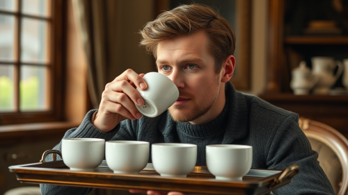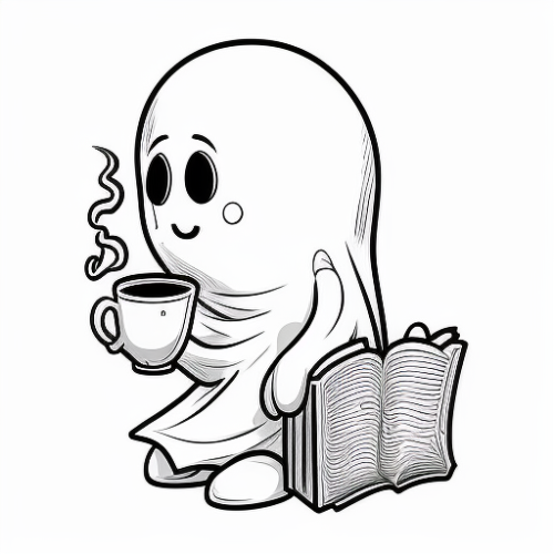 adorable little ghost with a steaming cup of coffee in his hands, colouring book style for adults, black lines, white background, side view, --v 4