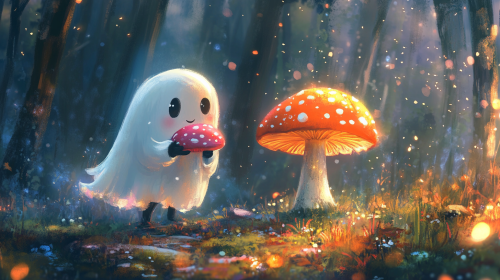 a scene with a ghost holding a pink and orange mushroom, very cute, Disney aesthetic, forest background, blurred background, twinkling lights in the distance, gorgeous scene, painting, DnD illustration, spooky cute, --ar 16:9