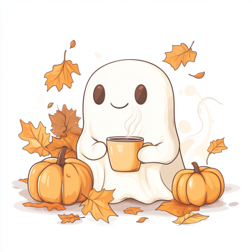 Adorable ghost holding a steaming coffee cup, surrounded by pumpkins with autumn leaves scattered around, warm and inviting art style, cozy and cheerful mood, soft, golden lighting, T-shirt design graphic, vector, contour, on a white background --no mockup, mockups, mock-up, mock, mocks
