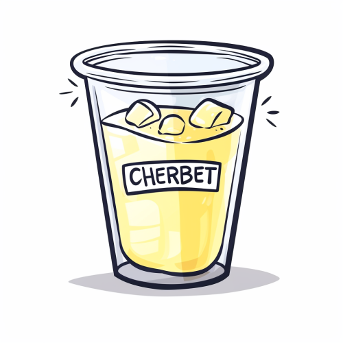 little transparent platic cup with pale yellow inside, written on the cup "CHERBET" the plastic cup is fresh, sticker, cartoon style , white background --v 5.2
