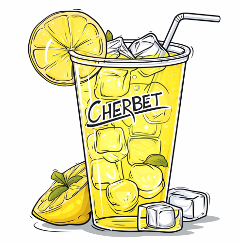 little transparent platic cup with yellow white lemonade, written on the cup "CHERBET" the plastic cup is fresh and there are ice cubes at the bottom of the glass, sticker, cartoon style , white background --v 6.0