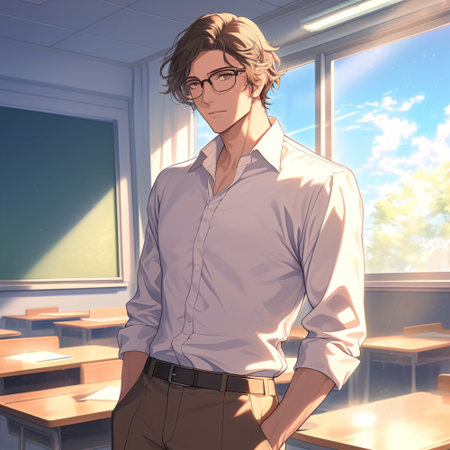 a handsome man, pale skin, short brown hair, brown eyes, wearing brown rimmed glasses, soft features, wearing white dress shirt with brown trousers, is a teacher, college classroom background daytime, modern theme, modern setting --niji 6