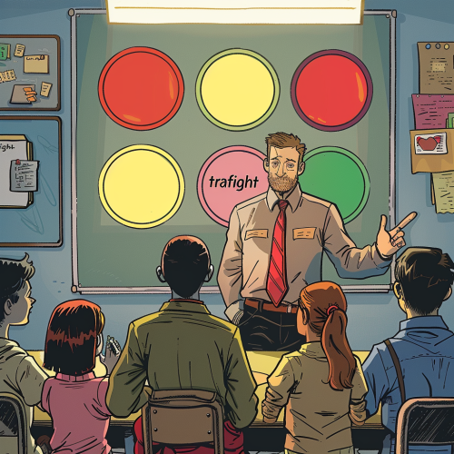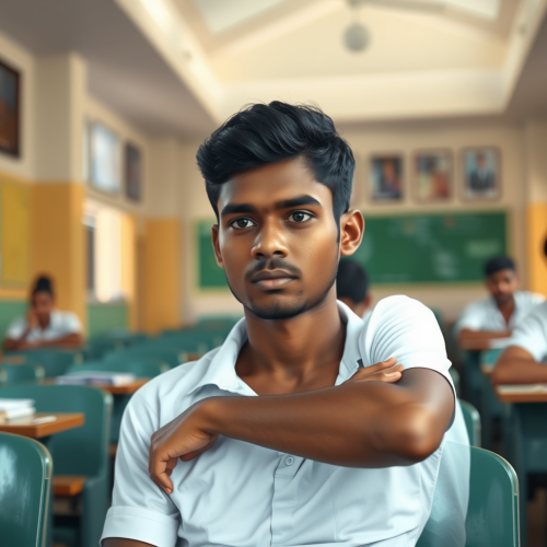 Background of a Taiwanese junior high or high school classroom. The focus is on a middle-aged Taiwanese teacher calling a student to the front of the class and loudly reprimanding them. The students seated at their desks in the background are silent and intimidated, creating a tense and uncomfortable atmosphere, with high detail and historical accuracy ,photograph --ar 16:9