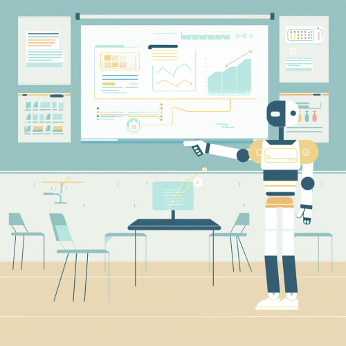 A flat, modern infographic illustration of a robot pointing like a teacher in a classroom setting, simplistic and cartoonish with soft curves, pastel color scheme of white, blue, yellow, and green, clear iconography for steps and sequence, digital tablet in view, flow of information highlighted with arrows and lines, important details emphasized with contrast --ar 1:1 --v 6.0
