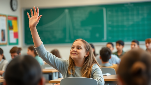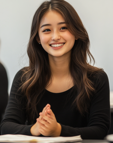 Photo of a beautiful young Japanese woman in her early to mid-20s, smiling and sitting at the desk of an English classroom, speaking with her hands clasped together. She is wearing a black long-sleeved shirt, and the lighting is natural. --ar 85:107