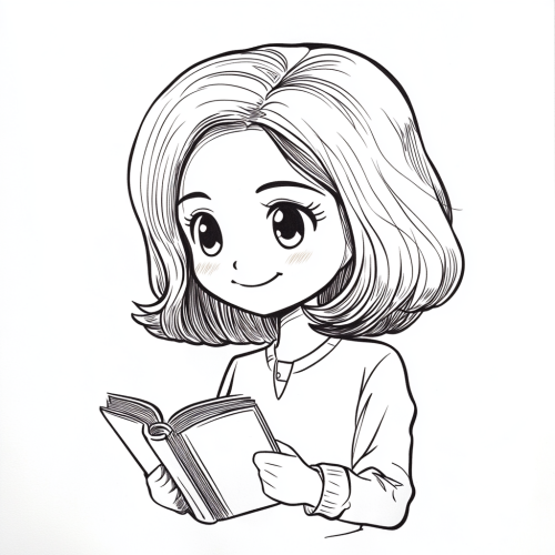 Cute chibi-style line drawing of a female English teacher with shoulder-length hair for Teacher's Day card, slightly side view, minimalist style, black lines on white background, featuring a smiling woman teacher with soft shoulder-length hair, holding a small book with simple English words, adorable and whimsical, clean design, centered composition --ar 1:1 --v 6.1