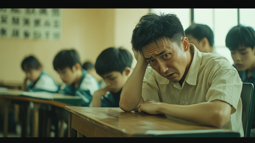 In a Taiwanese junior high or high school classroom, a middle-aged Taiwanese teacher is at the lectern, loudly reprimanding a student who has their head bowed. In the background, other students are seated at their desks, silent and anxious, creating a tense and subdued atmosphere in the classroom, with high detail and historical accuracy ,photograph --ar 16:9
