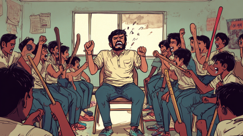 A teacher sitting on a chair in the center of an Indian classroom, surrounded by students forcing him to resign. The teacher is crying with exaggerated expressions of despair, while the students smile with mischievous satisfaction. Some students hold sticks, hockey sticks, and baseball bats. The scene has a comic caricature style, with exaggerated emotions, using only two colors (either black and white or warm tones), capturing the sad and intense atmosphere of the moment. --ar 16:9