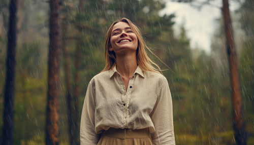 A realistic woman dancing with an umbrella: A graceful woman twirls in the rain, holding a vibrant red umbrella. Her dress flows with her movements, and the raindrops glisten in the light of the setting sun. Dark storm clouds hang above, but the mood is filled with hope and freedom. --v 6.0 --ar 2:3