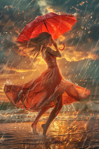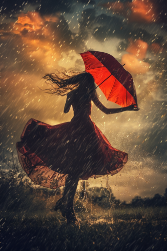 A woman dancing with an umbrella: A graceful woman twirls in the rain, holding a vibrant red umbrella. Her dress flows with her movements, and the raindrops glisten in the light of the setting sun. Dark storm clouds hang above, but the mood is filled with hope and freedom. --v 6.0 --ar 2:3