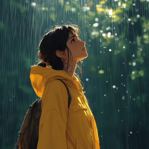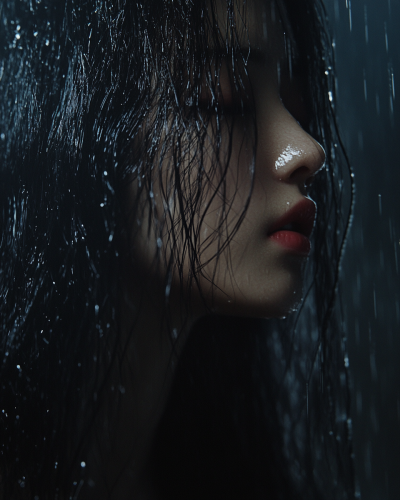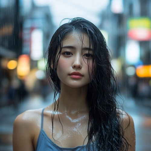 an Indian woman’s face wearing casual clothes stands in the rain, full body, in the style of Tatsuro Kiuchi, minimalism, simple --v 6.1 --c 25 --s 750