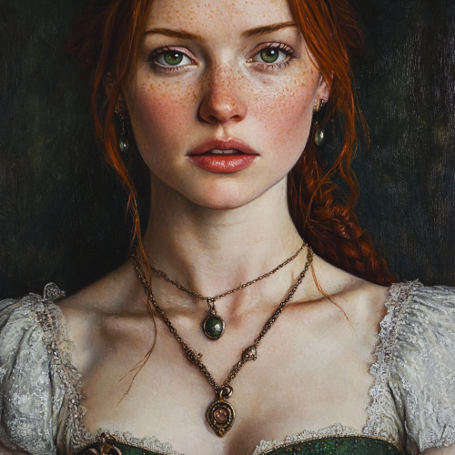 medieval gothic renaissance painting, game of thrones, woman with pale skin, green eyes, dark red hair, no makeup and light freckles, wearing a dress and mixed metal jewelry with gemstones