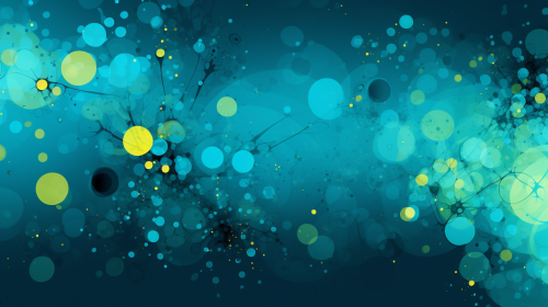 flat hyperdetail large and small liquid phase blobs with hundred random dots connecting and flying across image. monochrome bright marine blue aquamarine with chartreuse highlights. dark background. --ar 16:9