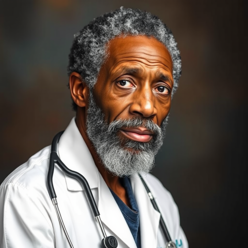 full body Picture of a serious african american doctor big and tall doctor in open hands in his 40s, wearing doctor uniform, whole body picture, white background