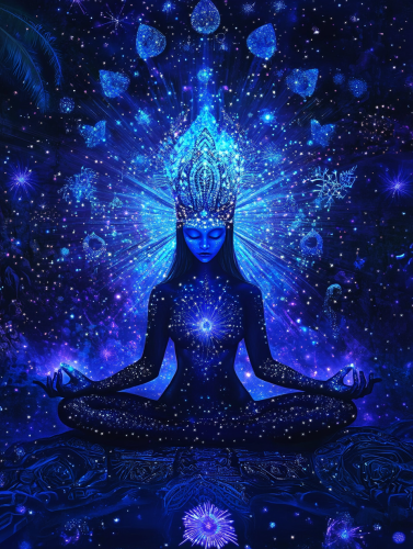 In the middle of the liquid sapphire galaxy there is an alien goddess of great beauty made of constellations and faceted opals doing yoga in the warrior posture, magnificent perfection and beauty, elegance and ancestral delicacy., fantastic realism, iridescent, extraterrestrial, retrofuturism, space art, tribal art, integrated art, realistic art, glowing, photopainting, deep colors, lustrous, plush, shining, sparking, fantasy, electric colors, magic realism, native art, rainbowcore, romanticism, tiki, witchcore, wonderland, --ar 3:4 --v 6.1