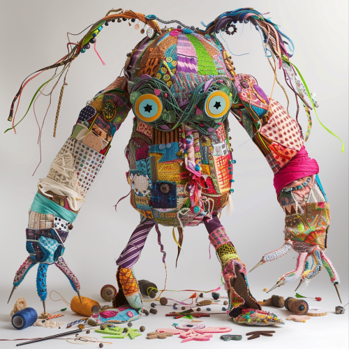A Craft Elemental in a fantasy world, humanoid in form but composed of various handcrafted materials like fabric, yarn, paper, and clay. Its body has patchwork sections with bright, colorful patterns of stitched fabrics and woven threads. Its arms and legs are made of twisted yarn and string, while its torso is adorned with small handcrafted beads, buttons, and delicate paper cutouts. Parts of its body resemble intricately shaped clay, giving it a homemade, artistic feel. The elemental's eyes glow with a creative spark, and it radiates an aura of craftsmanship. The environment around it is filled with crafting tools, spools of thread, paintbrushes, and scattered colorful materials, creating a whimsical and imaginative atmosphere. --v 6.0