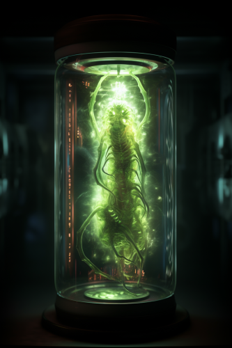 alien creature in cylindrical glass container, ambient light, HD, 4K , ultra detailed, photorgraphy --ar 2:3 --v 5.2