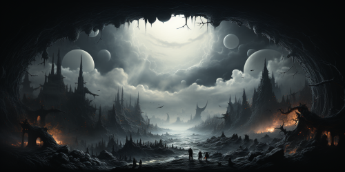 Design a monochromatic extraterrestrial scene resembling a coloring book, drawing inspiration from H.R. Giger and Beksinski, featuring intricate organic forms, alien landscapes, and enigmatic creatures, Illustration, pen and ink on toned paper, --ar 2:1 --s 750